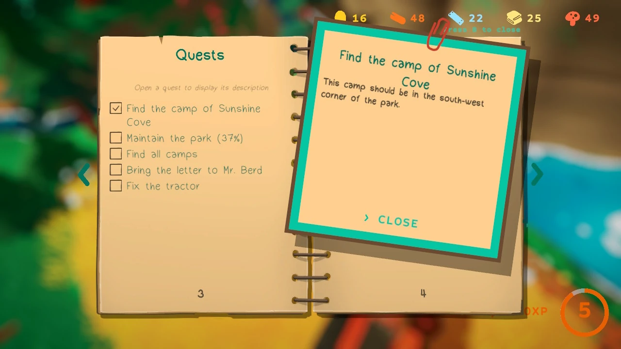 "Find the camp of Sunshine Cove" quest when selected in the Notebook